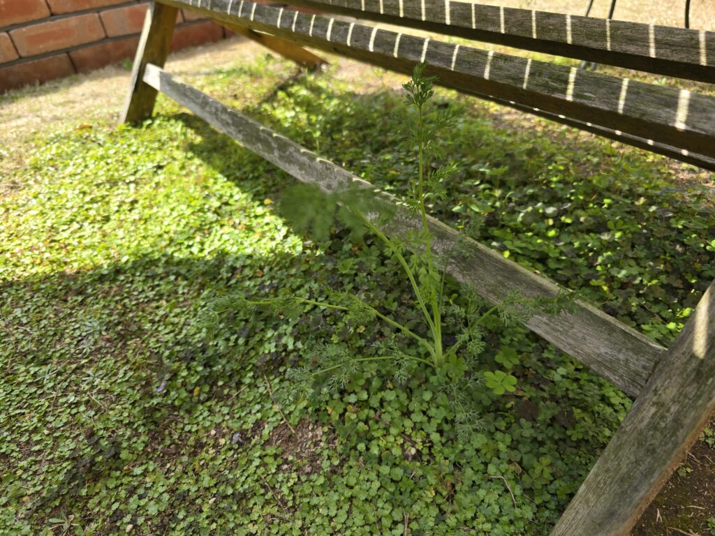 こぼれ種でベンチの下にオルレヤホワイトレースが咲いてます。(^.^)